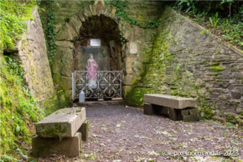 Chapelle, des fonts baptismaux extérieurs mènent vers le Saint piqué où les jeunes filles à marier formulaient leurs vœux...