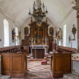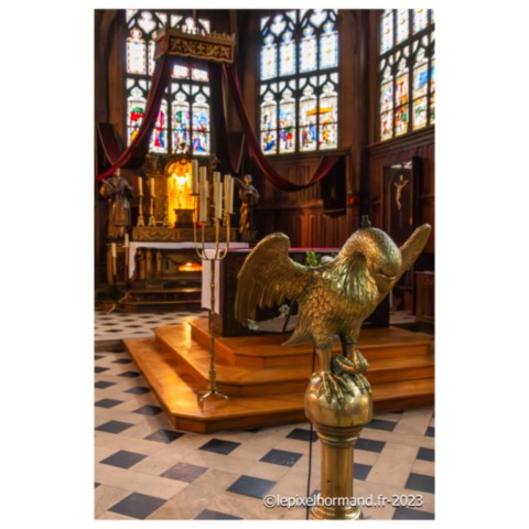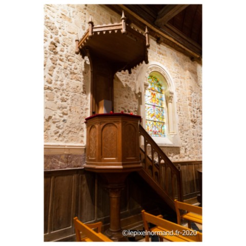 L'édifice abrite de riches boiseries de choeur avec ses stalles ainsi que des fonts baptismaux dans l'entrée de la nef.