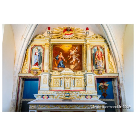 Les débuts de la construction datent du XIIe siècle dont le chœur offre de magnifiques traces romanes, notamment les chapiteaux et les arc-doubleaux dont certains conservent une trace de polychromie. Le pavage au sol comporte des motifs de fleurs de lys en s’accordant parfaitement à la voûte en bois. Le maître-autel, qui a retrouvé son lustre d’antan par une récente restauration des peintures et des bois dorés, est surmonté d’un retable contenant un tableau de l’Annonciation des XVIIe ou XVIIIe siècles.