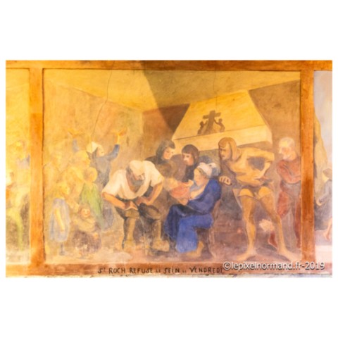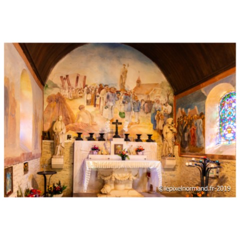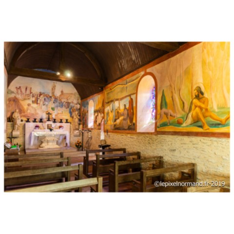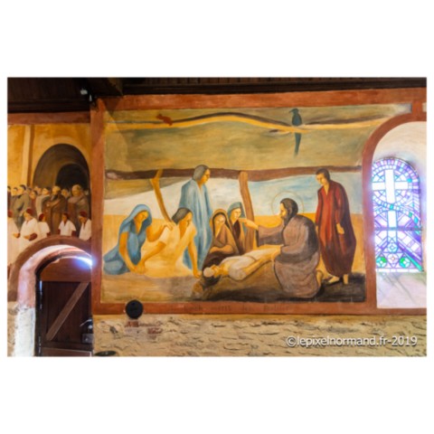 Chapelle, les fresques racontent l’histoire du saint patron de l’édifice et la vie des Normands en pèlerinage au pied de la source