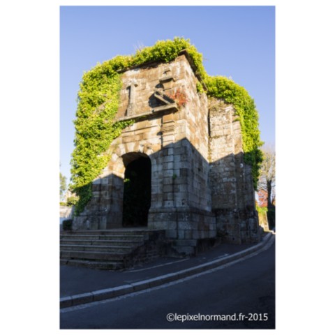 La porte horloge, vestige de la ville fortifiée et du château, était la principale entrée au Moyen Âge. Elle est construite au XIIIe siècle. Protégée par un large fossé d’environ sept mètres de large et cinq de profondeur, il fallait encore passer le pont-levis à flèches, la herse et une grande porte à deux vantaux pour accéder à la ville. En 1480, celle-ci fut surélevée d’un niveau la transformant en beffroi afin de surveiller les approches de la ville et de prévenir toute attaque. En 1499 furent ajoutés une horloge et une cloche. Deux autres cloches sont ajoutées au XIXe siècle. Bien que la ville fut détruite à 95% lors des bombardements de juin 1944, la tour fut relativement épargnée. Ville fortifiée, le donjon reste également un des rares vestiges du château et des remparts à doubles enceintes des XIe et XIIe siècles.