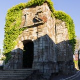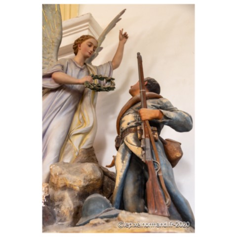 Église : passer les anciennes pierres tombales pour arriver au pied de la statue du soldat couronné
