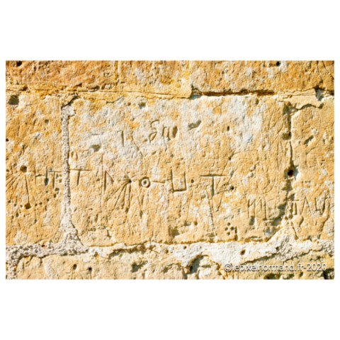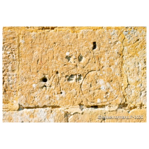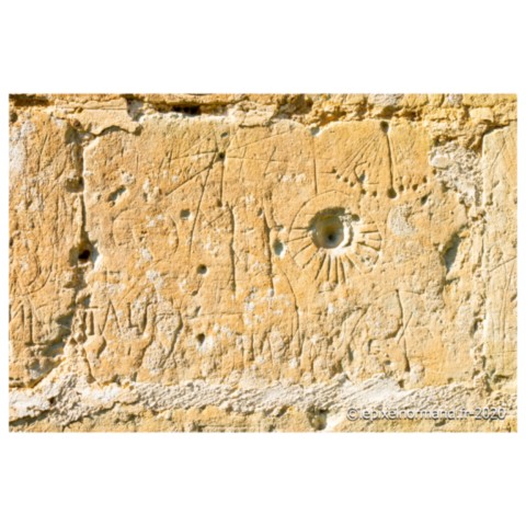 Le mur sud de l’église comporte des graffiti (un nom, une année ou une silhouette d’un homme chapeauté…) mais également des cadrans canoniaux. Ces marques gravées généralement d’une manière très sommaire permettaient d’indiquer à une communauté les sept célébrations religieuses journalières.