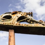 Église, tout près une pièce de métal se dresse tel une tête d’animal étrange