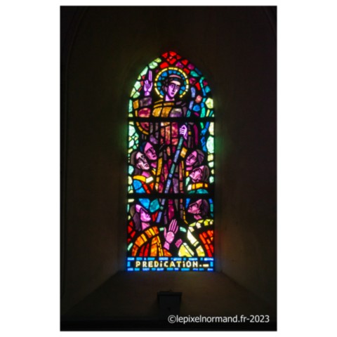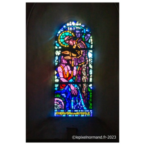 Dans l'église, les vitraux racontent la vie du Saint à la source