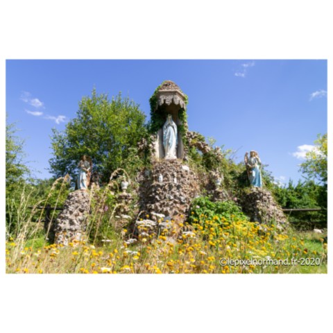 Au beau milieu de la campagne Ornaise, ce monument surprend. Composé de rochers en silex, la Vierge, les anges et les vases sont tous en fonte. Il fut construit par un maçon de la région en 1925, grâce à un don du curé du village à l’époque.