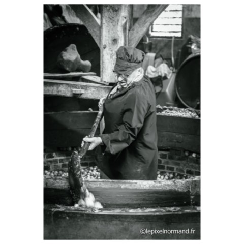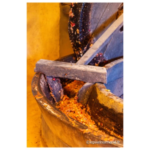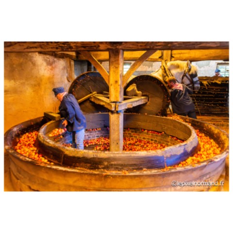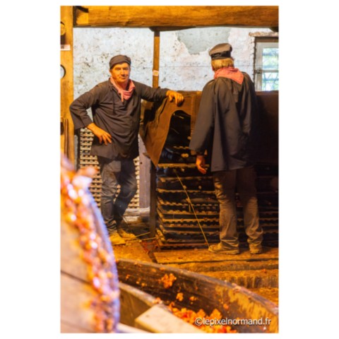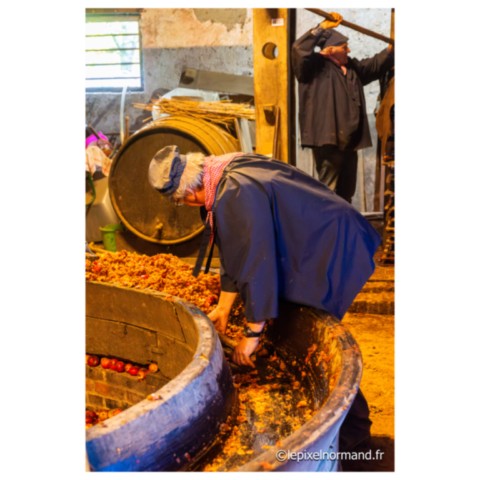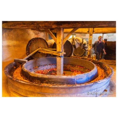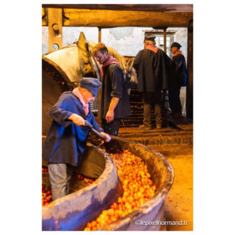 Régulièrement sont organisées au conservatoire des métiers de la pomme, des manifestations représentant le savoir-faire et les traditions des métiers d’autrefois en costumes et avec le matériel d’époque : broyage et pressage des pommes pour la conception du cidre et du jus de pomme, distillation du Calvados sont au programme de cet après-midi riche en ambiance et en parfums… Un cheval percheron broie les pommes en tirant deux imposantes meules en bois dans le tour à piler (appelé aussi gadage). Un rabot à l’arrière des meules recentre les fruits sous le passage des roues. Le tour présent ici date du XVIIIe siècle. Des fruits pillés est extrait le marc. Le pressage du marc appelé pressurage va alors être réalisé dans un pressoir, ici dit à grande étreinte. Le marc est étalé en couches successives séparées par de la paille ou par des grosses toiles de jute spécifiques. Ces manifestations à la bonne odeur de pommes pillées et de vapeurs de distillation du Calvados attirent une foule considérable (rendant les photos parfois très compliquées à réaliser !!!).