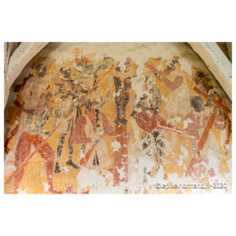 Le maire de la commune demanda un jour au cantonnier de faire "un peu de ménage" dans l’église. Celui-ci s’affaira fortement à la tâche, suffisamment en tout cas pour découvrir des traces de peintures murales sous le badigeon. L’ensemble de l’édifice doit en être entièrement recouvert, mais seulement quelques parties sont actuellement visibles dont une représentant la messe (au dessus de Sainte-Thérèse) laissant apparaître un officiant et trois notables assistant à l’office. Une troisième peinture raconte la légende dite des trois morts et des trois vifs, ceux-ci sont des jeunes hommes plein d’orgueil issus de puissantes familles royales, ducales et comtales. Ils rentrent de la chasse. Dieu, voulant les avertir, fait brusquement surgirent trois morts décharnés devant eux. Les trois vivants sont pétrifiés. Les morts s’adressent alors aux trois seigneurs en les exhortant à se repentir: "Tel je fus comme tu es, et tel que je suis tu seras. Richesse, honneur et pouvoir seront dépourvus de valeur au moment de votre trépas". Puis les morts laissent les vivants pâles et apeurés.