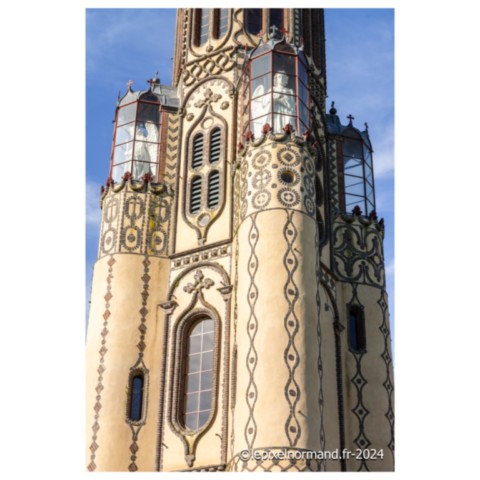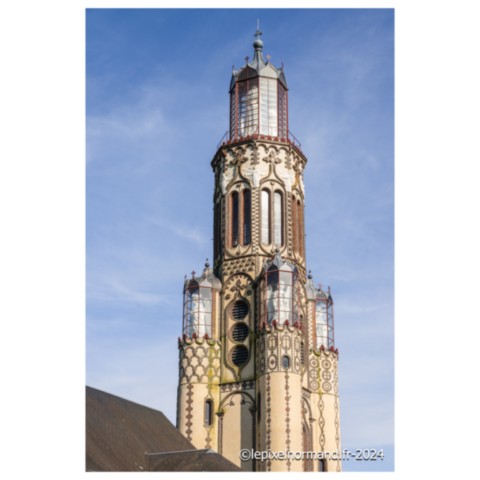 L'église est prolongée d'une tour contenant le clocher. La tour est octogonale, décorée de briques polychromes et cantonnée de quatre tourelles surmontées d'archanges. Au sommet de la tour, une verrière abrite le groupe de La Salette rappelant l'apparition de 1846 près de Grenoble.