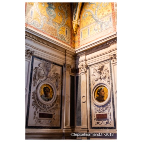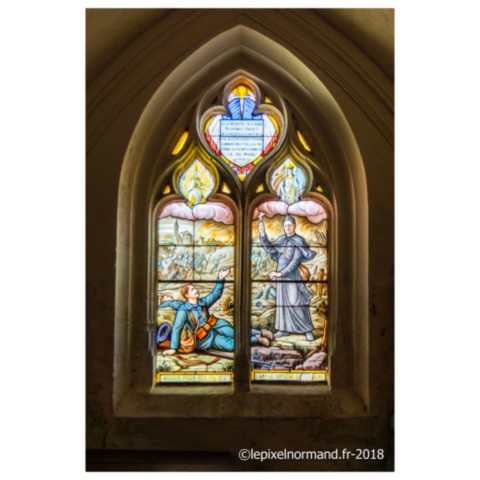 Un élément unique est la présence de portraits de "poilus" de la Première Guerre mondiale intégrés aux vitraux du XXe siècle.
