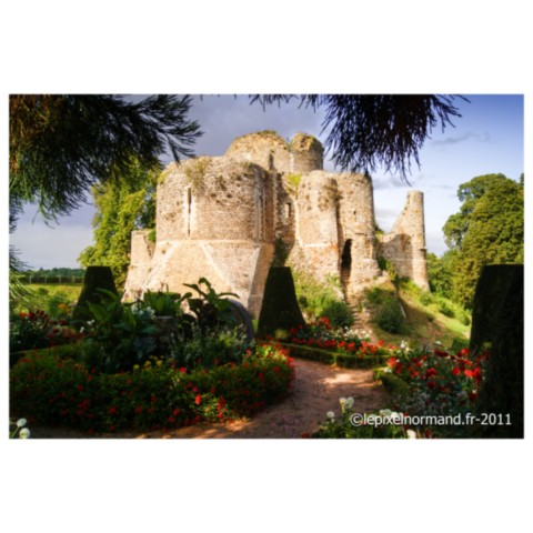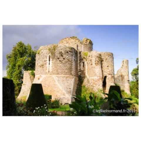 La construction du château et de son donjon débute vers 1034 sur une motte. La bâtisse possédait des murs de 2,60 mètres de large sur une hauteur de trois étages. Le rez de chaussée sans fenêtres était consacré à la réserve des vivres. Un puits central servait à alimenter le château en eau potable. Il sera agrandi au cours du XIIIe siècle avec l’ajout de tours à l’enceinte extérieure. Successivement sous les possessions Française et Anglaise, il sera démantelé au XVIe siècle.