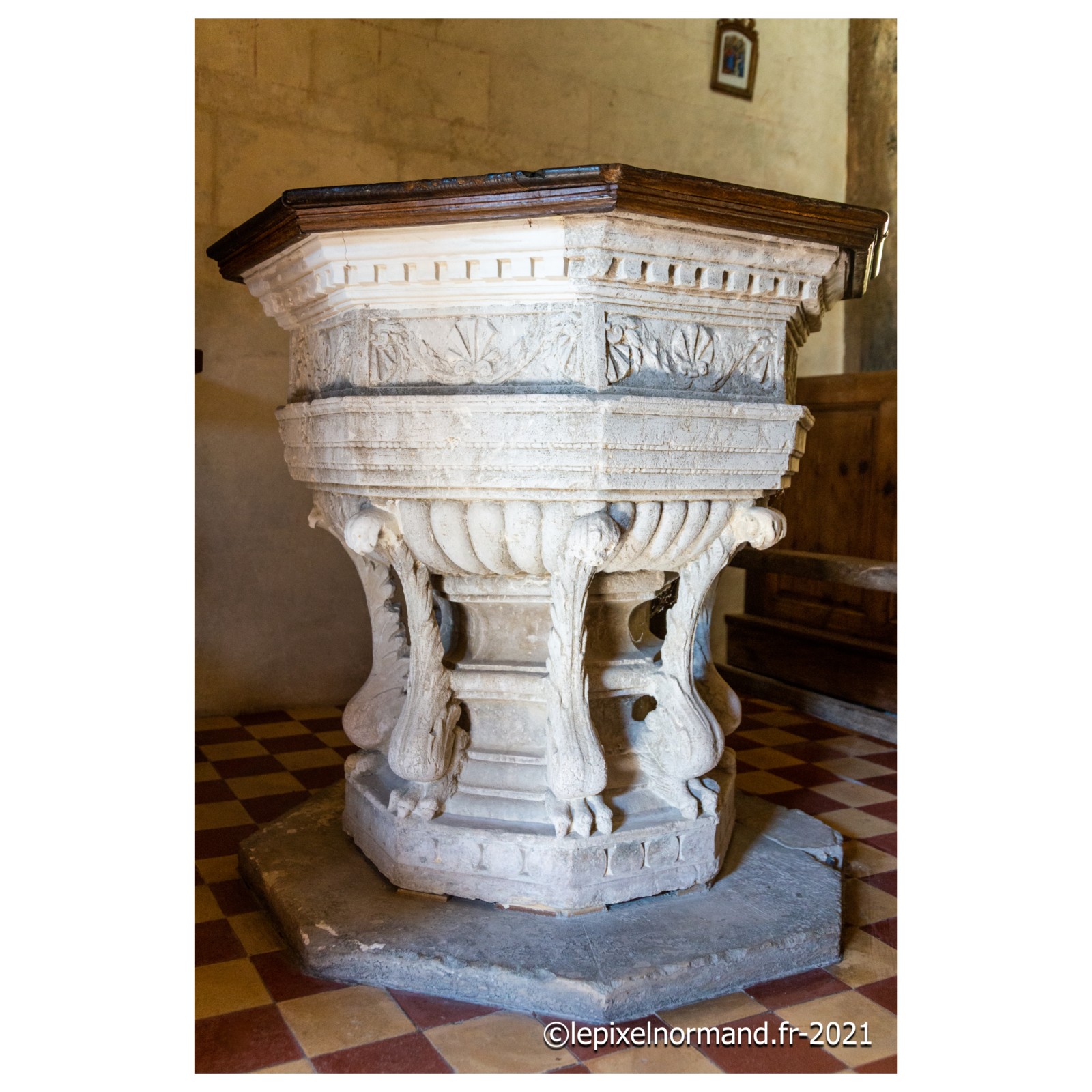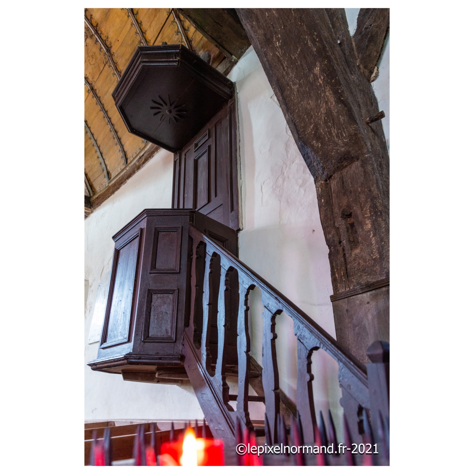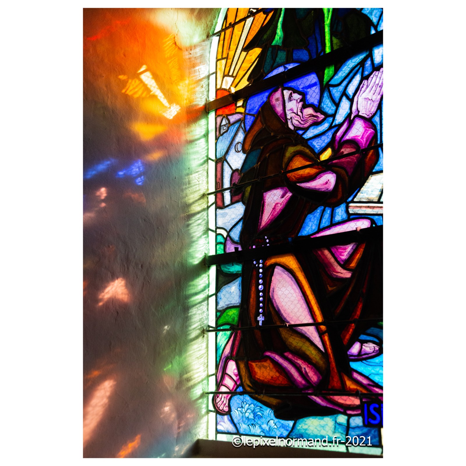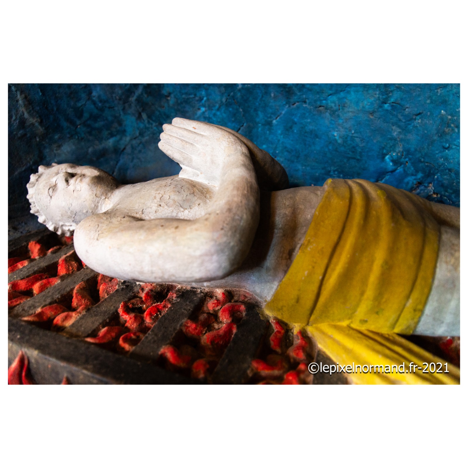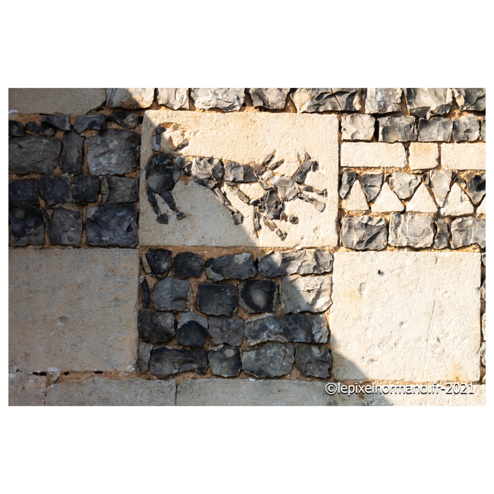 On raconte que c’est ce qui advint car la femme et la chaîne qui maintenait la pierre autour de son coup surnagèrent. En ex-voto et dans son repentir, le Sir fit encastrer la pierre miraculeuse dans le mur de l’église, juste au pied de la statue de Notre-Dame (photo 4 de l'église).