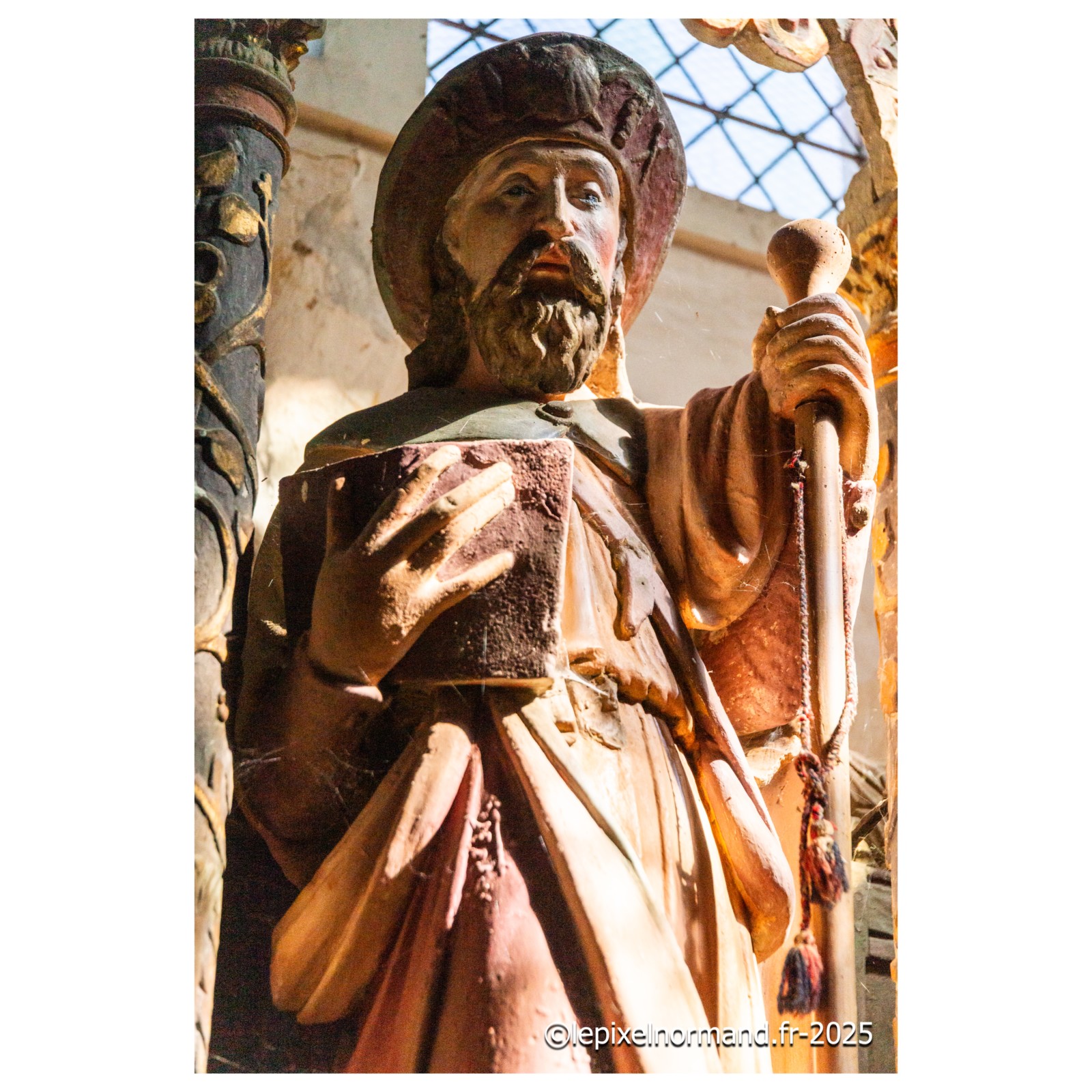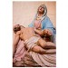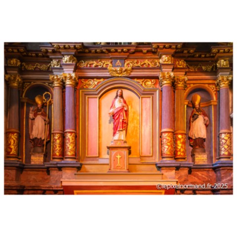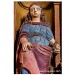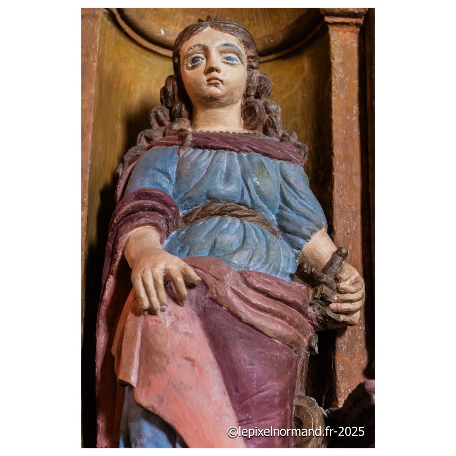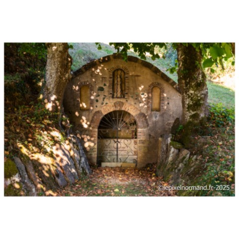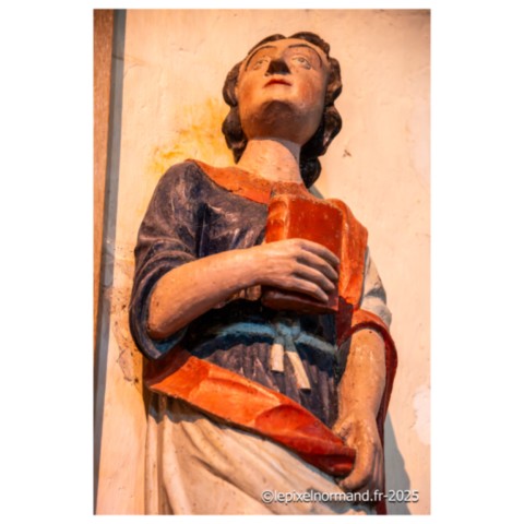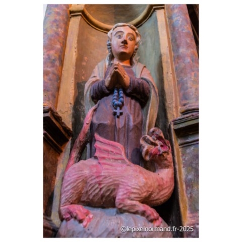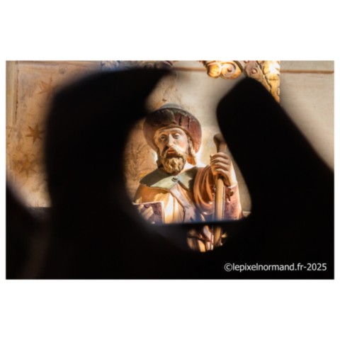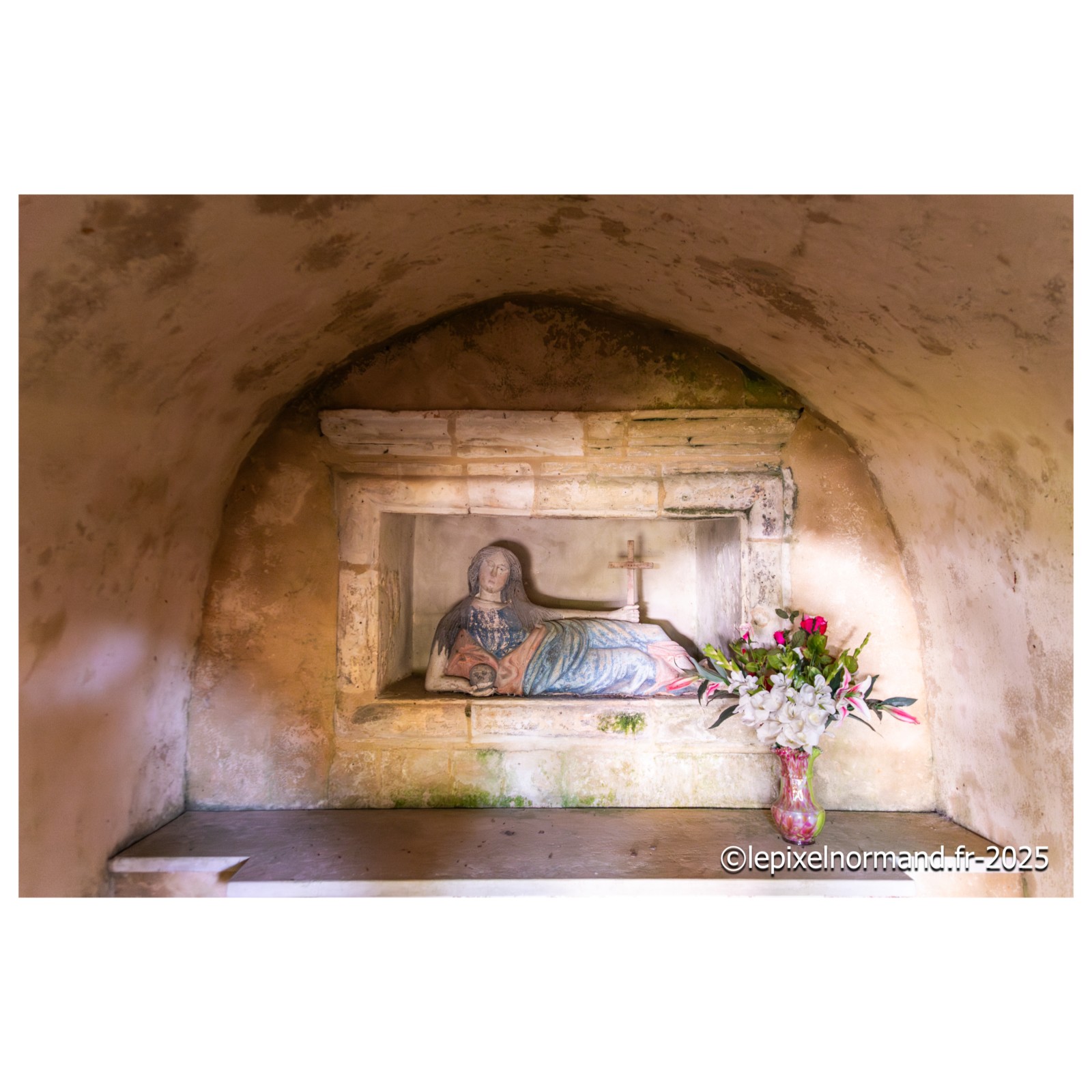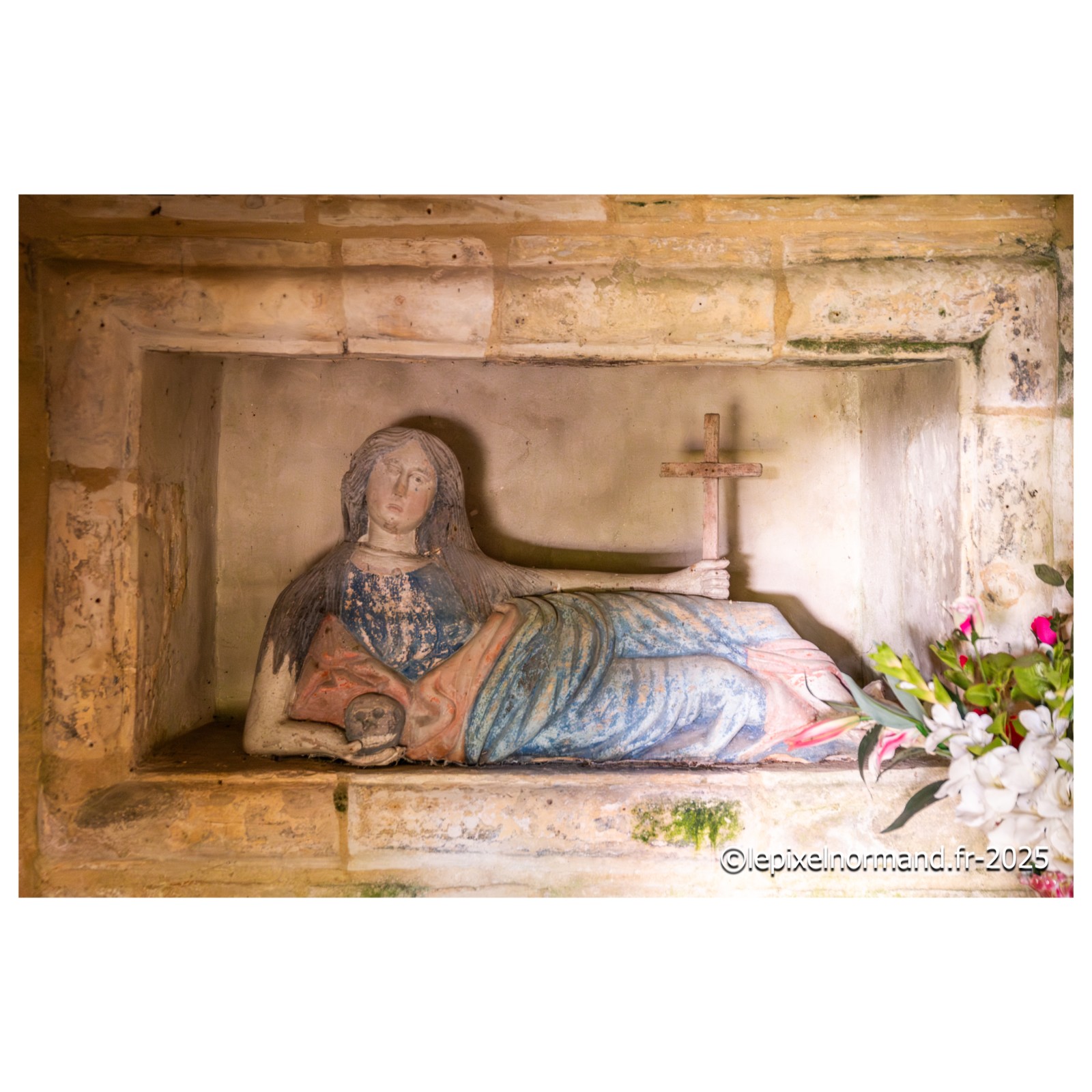 Il existe plusieurs légendes controversées, mais voici la plus répandue. Marie de Magdala, femme de Judée, menait une vie de luxure et de débauche, son âme captive de ses désirs, jusqu'à ce que sa rencontre avec le Christ change son destin. Le parfum précieux qu'elle versa sur les pieds du Seigneur n'était pas une simple fragrance : c'était une offrande, un signe de repentance et de gratitude. Elle les essuya avec ses longs cheveux pour exprimer sa profonde humilité et son amour absolu au Christ. Cet acte de dévotion scella son pardon. Elle devint la plus fidèle des disciples, accompagnant Jésus jusqu'à sa crucifixion. Après sa mort, elle fut la première à découvrir le tombeau vide, puis à voir le Seigneur ressuscité, devenant l'apôtre des apôtres. La légende raconte qu'elle embarqua sur une barque sans voile pour échapper aux persécutions, car, après la mort de Jésus, les autorités juives et romaines ont intensifié leur répression contre ses disciples. En tant que témoin de la Résurrection et figure de proue du nouveau mouvement chrétien, Marie-Madeleine était en grand danger. Elle accosta sur les côtes de Provence. Là, elle choisit la solitude, se retirant dans la grotte de la Sainte-Baume. Trente années durant, elle y vécut une vie d'ermite, son cœur consumé par l'amour divin et le souvenir du Christ. Elle est représentée tenant un crucifix en contemplation, symbole de sa foi inébranlable, et une tête de mort, rappelant la vanité du monde et la nécessité de se préparer à la mort pour atteindre la vie éternelle.