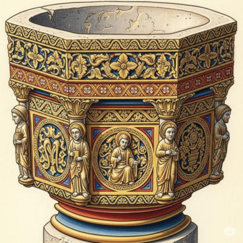 Dans le catholicisme, les fonts baptismaux servent typiquement aux baptêmes par aspersion. Les fonts les plus simples ont un pilier avec un support pour un bassin d’eau. Les matériaux taillés et sculptés varient considérablement, allant de la pierre au marbre, au métal ou au bois. Le plus souvent les fonts baptismaux sont situés dans l’angle nord-ouest de l’église, soit à gauche en entrant ce qui métaphorise la sortie par le baptême de l’ombre humide à la chaude lumière. La forme peut varier. Beaucoup de fonts baptismaux ont huit côtés pour rappeler la nouvelle création. L’octogone est intermédiaire entre le rond naturel et le carré culturel. Certains fonts ont trois côtés pour rappeler la Sainte Trinité : Père, Fils et Esprit Saint. Ils sont parfois placés devant la nef de l’église pour rappeler aux fidèles leur baptême, qui représente leur entrée dans l’Église. Dans plusieurs églises du Moyen Âge et de la Renaissance, une chapelle spéciale ou même un bâtiment dédié, dit « baptistère », abritait les fonts baptismaux.